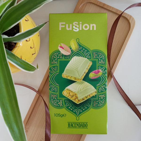 Fusion Pistachio White Chocolate Bar 105g – White Chocolate (52%) (sugar, cocoa butter, whole milk powder, whey powder, anhydrous milk fat, emulsifiers (lecithins, E-476), flavouring) Pistachio (13.7%), Sugar, Vegetable Oils and fats (shea, coconut, sunflower) Toasted Shredded Filo Pastry: 6.4% (wheat flour (gluten), water, salt), Skimmed Milk Powder, Almond, Emulsifier: Lecithins, Natural Colours, (safflower concentrate, spirulina, lemon), Maltodextrin, Acidity Regulator (citric acid), Flavourings. May contain other nuts, peanuts, soy, egg and mustard.
